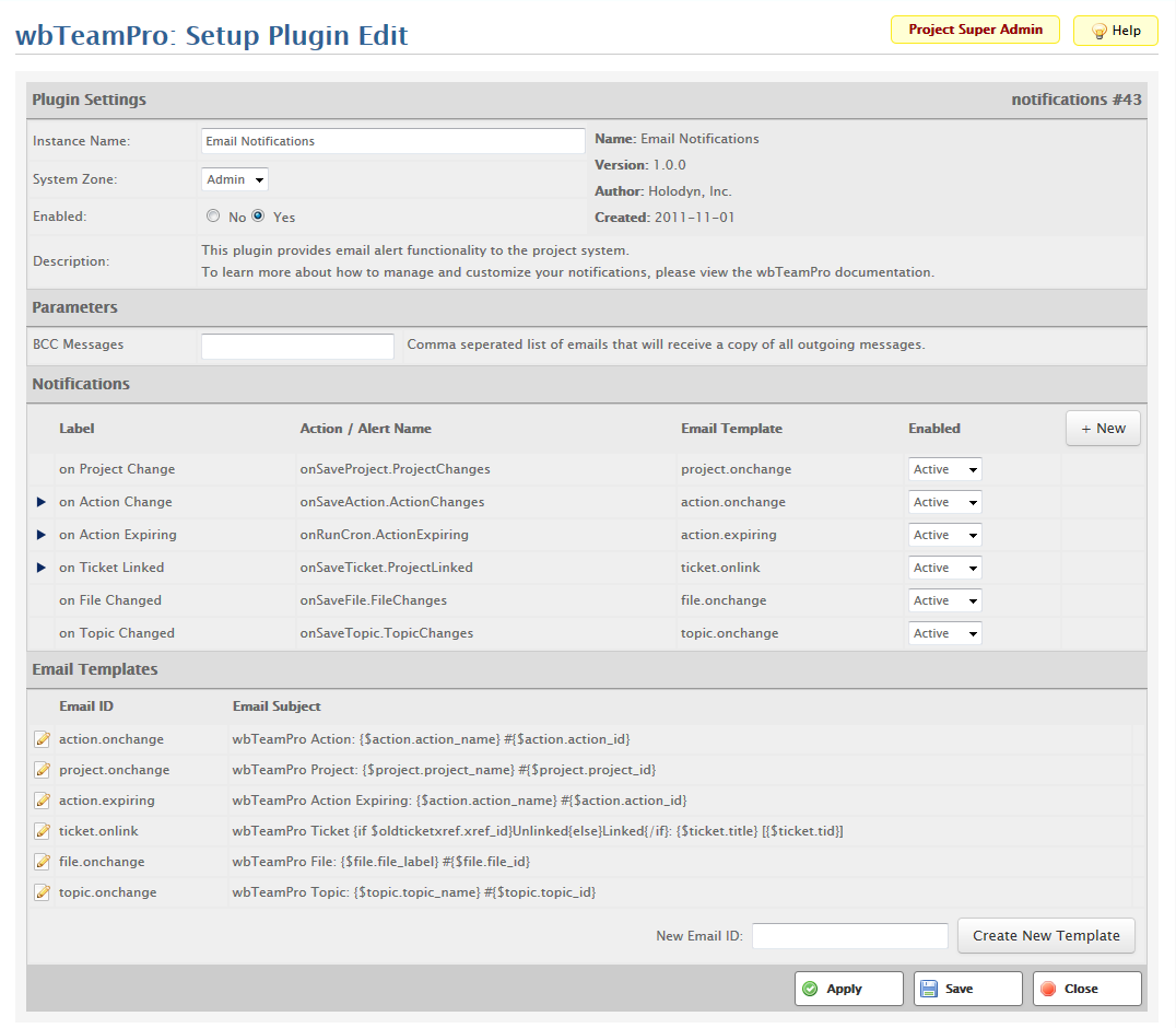 Email Notifications can be configured to automatically alert individuals when a project is modified or an action is expiring. The Notifications system can be configured with additional BCC email addresses that can be used to monitor all system notifications.
