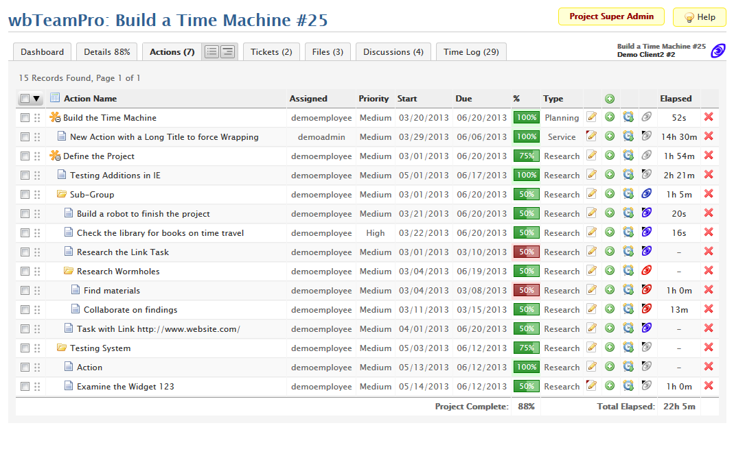 Project Actions are managed via the Actions Tree where new actions can be quickly appended, edited, and arranged throughout the planning and execution of a project. The Action logic uses a Milestone, Task Group, and Task hierarchy that automatically follows the nesting of Tasks within their parent. Milestone and Task Group completion is automatically managed by the completion of Task children, which will each track individual Time Log events toward completion. Additional Actions List and Actions Gantt Chart displays provide a range of interactive methods for managing the activities within each project.